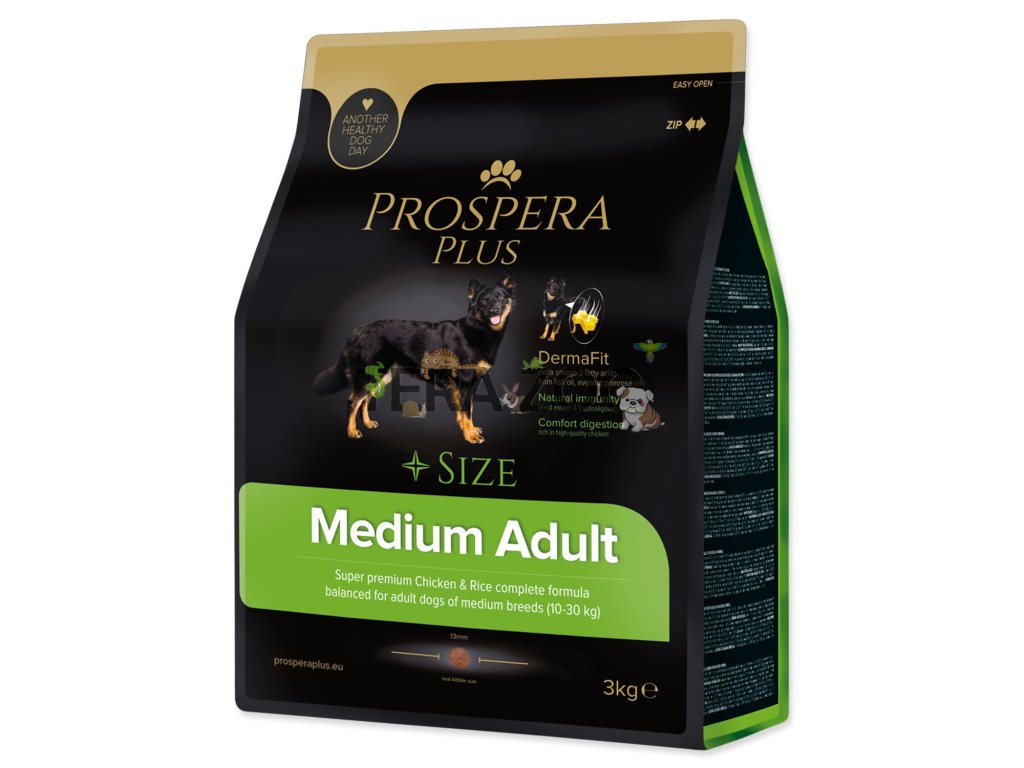 Prospera Plus Medium Adult kuře s rýží je superprémiové kompletní krmivo pro dospělé psy středních plemen s vysokou aktivitou. Obsahuje 30 % kuřecího, 25 % bílkovin a 3 720 kcal/kg, což podporuje svalstvo a denní výkon. Receptura kombinuje rybí tuk a pupalkový olej pro zdravou srst a fruktooligosacharidy s kvasničným extraktem pro lepší trávení a imunitu. Vyrobeno v Česku s antioxidanty schválenými EU, balení má 3 kg.