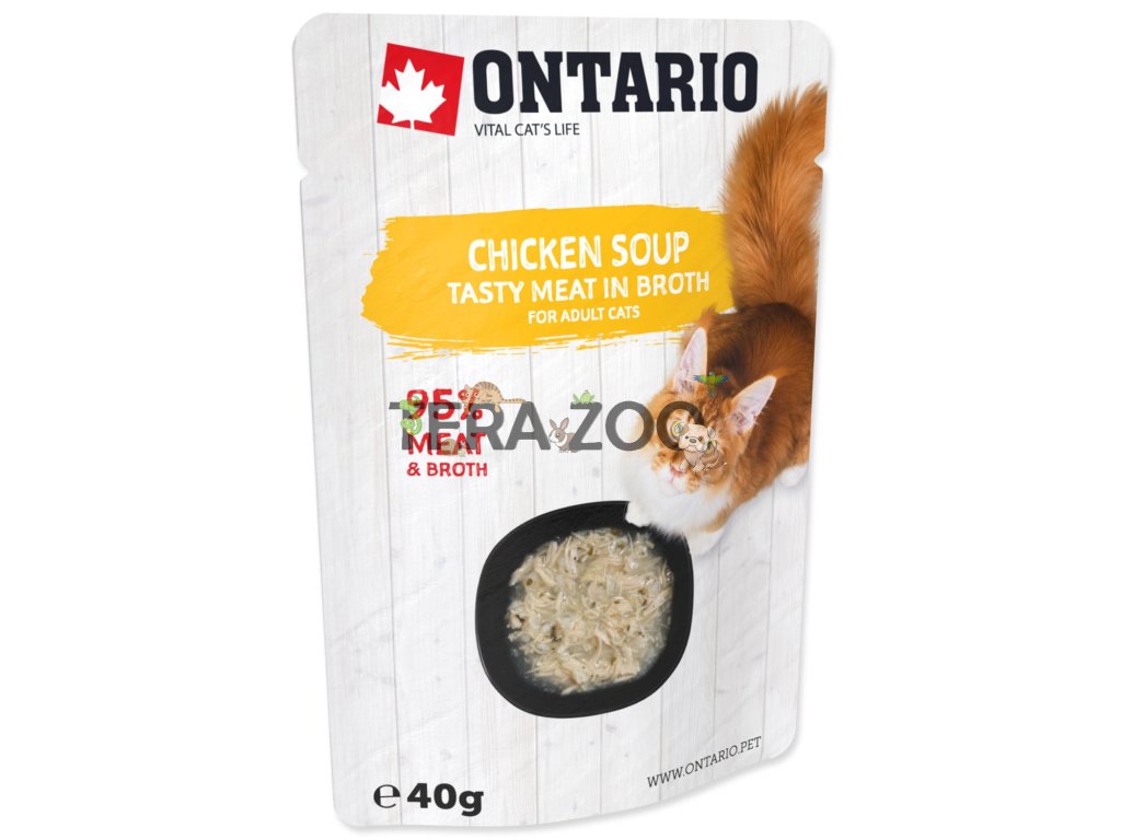 Doplňkové krmivo pro dospělé kočky – polévka s kousky kuřete a zeleninou, kterou můžete dopřát samostatně nebo jako doplněk k suchému krmivu.