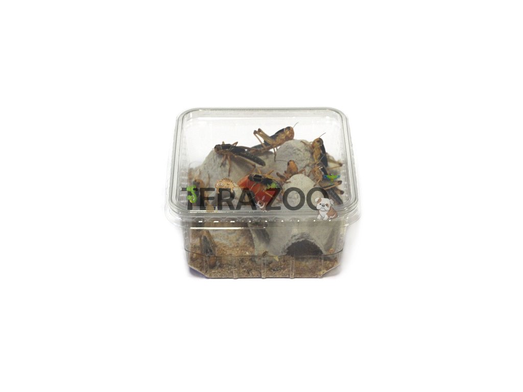 Plastová krabička obsahuje 12 ks sarančat. Aby byl zajištěn dostatečný přísun vzduchu krabička je perforovaná.