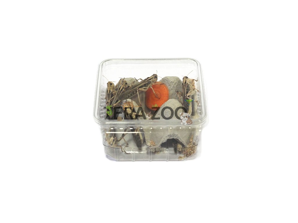 Plastová krabička obsahuje 10 ks sarančat. Aby byl zajištěn dostatečný přísun vzduchu krabička je perforovaná.
