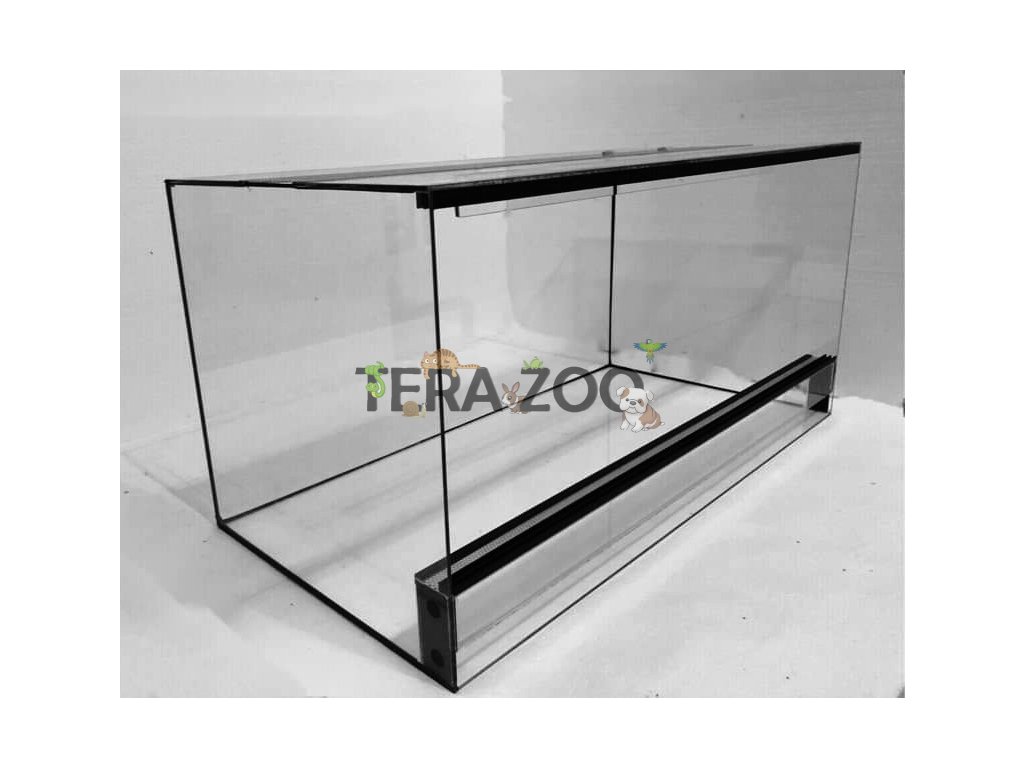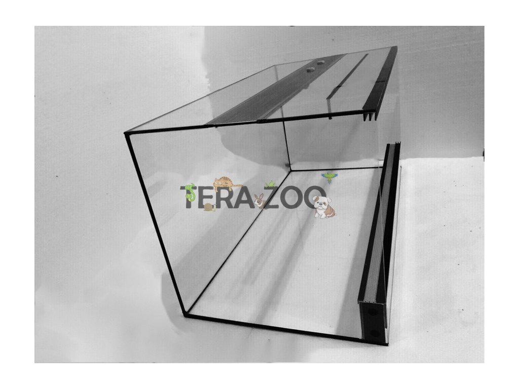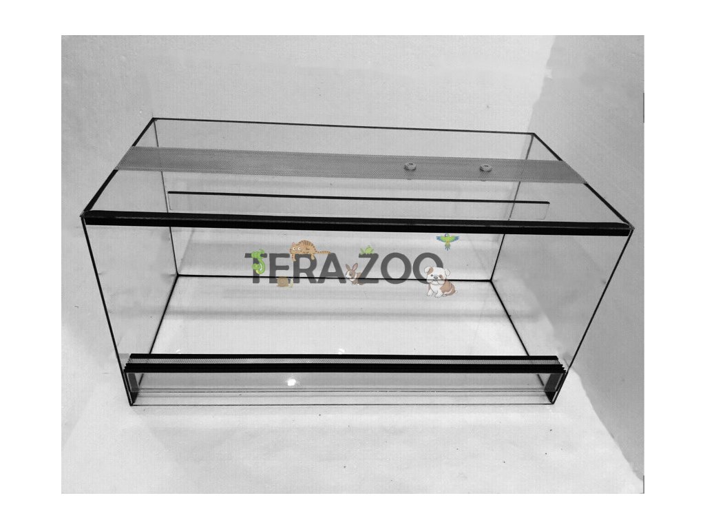 Skleněné terárium o různých rozměrech o šířce skla 4-6 mm, které je vybavené spodním a vrchním odvětráváním pro správnou cirkulaci vzduchu a připravenými průchody pro kabeláž k osvětlení.